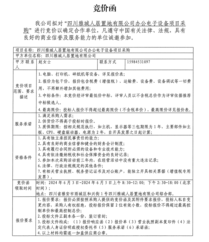 四川雅城人居置地有限公司辦公電子設(shè)備項(xiàng)目采購競價(jià)公告