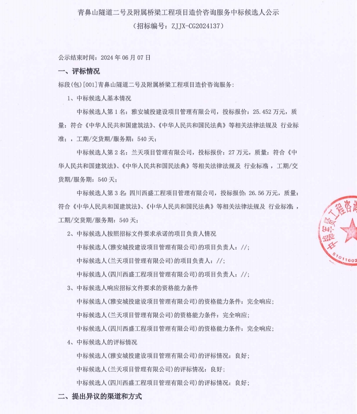 青鼻山隧道二號及附屬橋梁工程項(xiàng)目造價(jià)咨詢服務(wù)中標(biāo)候選人公示