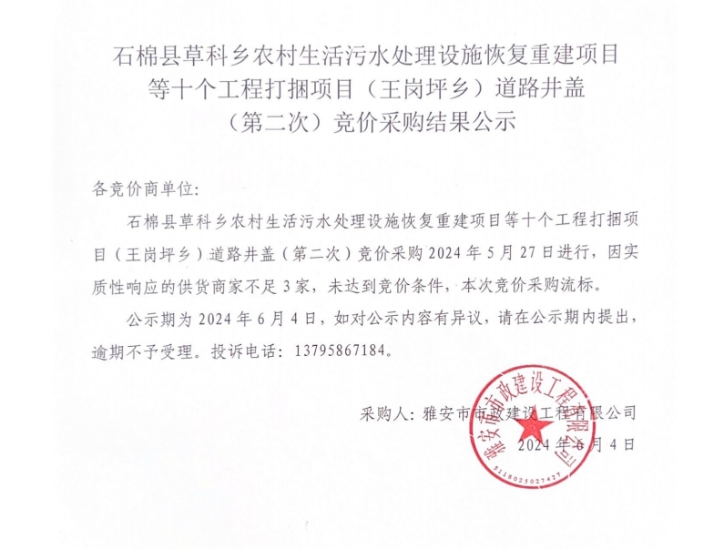 石棉縣草科鄉(xiāng)農(nóng)村生活污水處理設施恢復重建項目等十個工程打捆項目(王崗坪鄉(xiāng))道路井蓋(第二次)競價采購結果公示