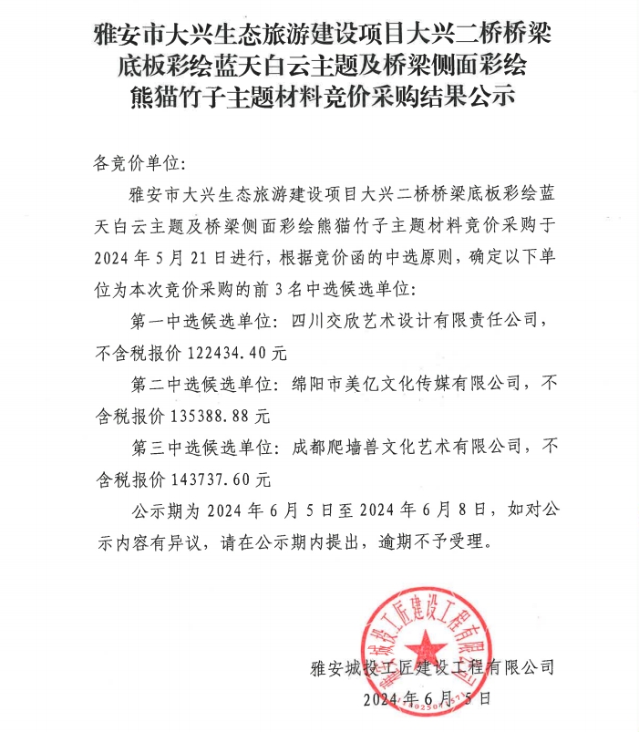 雅安市大興生態(tài)旅游建設(shè)項(xiàng)目大興二橋橋梁底板彩繪藍(lán)天白云主題及橋梁側(cè)面彩繪熊貓竹子主題材料采購(gòu)結(jié)果公示