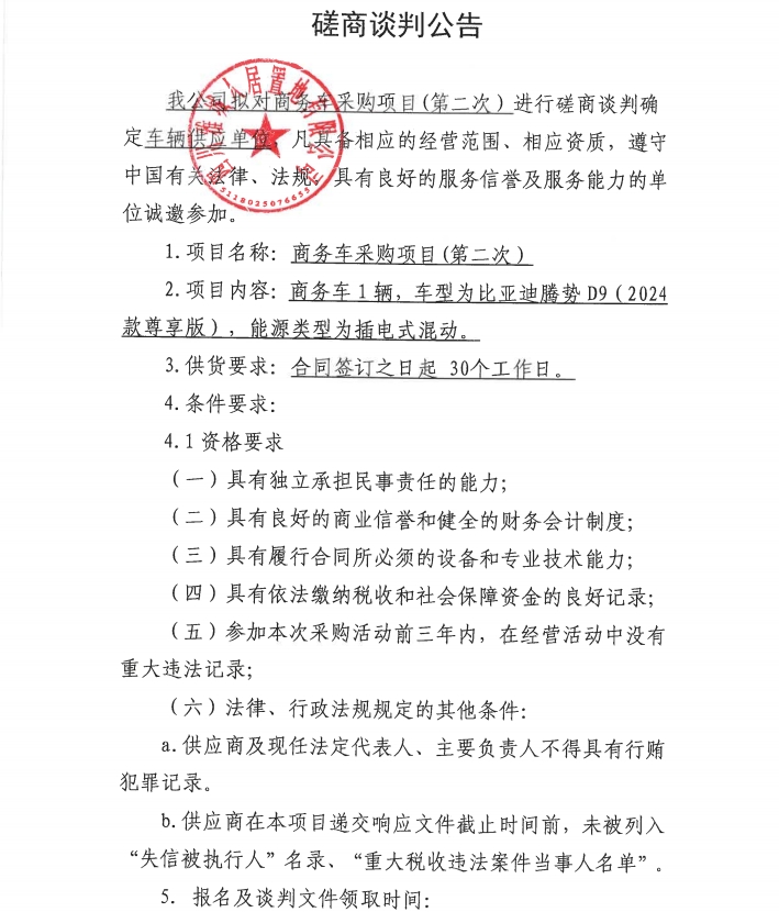 商務(wù)車采購項目(第二次)磋商談判公告