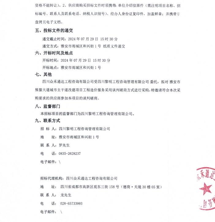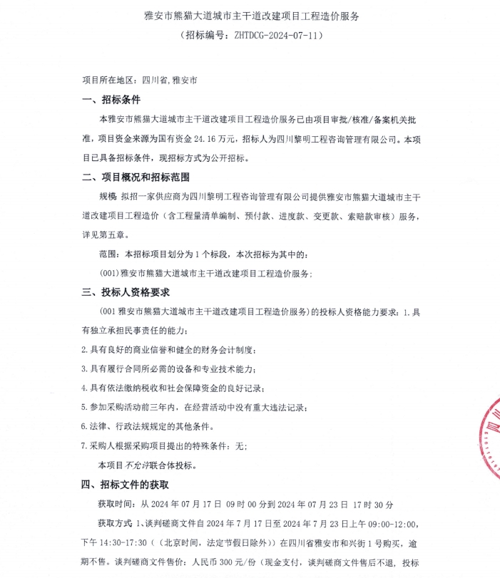 雅安市熊貓大道城市主干道改建項目工程造價服務公告