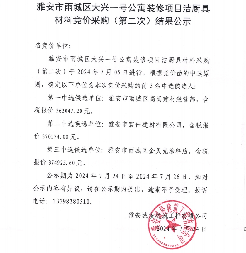 雅安市雨城區(qū)大興一號公寓裝修項(xiàng)目潔廚具材料競價(jià)采購(第二次)結(jié)果公示