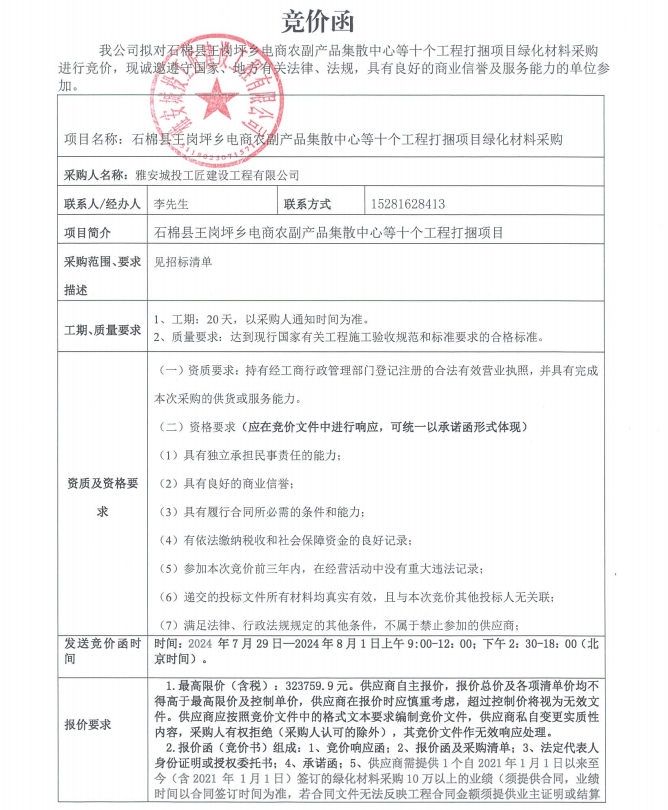 石棉縣王崗坪鄉(xiāng)電商農(nóng)副產(chǎn)品集散中心等十個(gè)工程打捆項(xiàng)目綠化材料競(jìng)價(jià)函