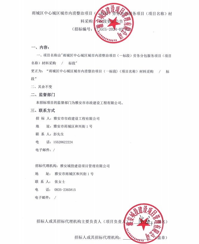 雨城區(qū)中心城區(qū)城市內(nèi)澇整治項(xiàng)目(一標(biāo)段)勞務(wù)分包服務(wù)項(xiàng)目(項(xiàng)目名稱)材料采購/標(biāo)段更正公告
