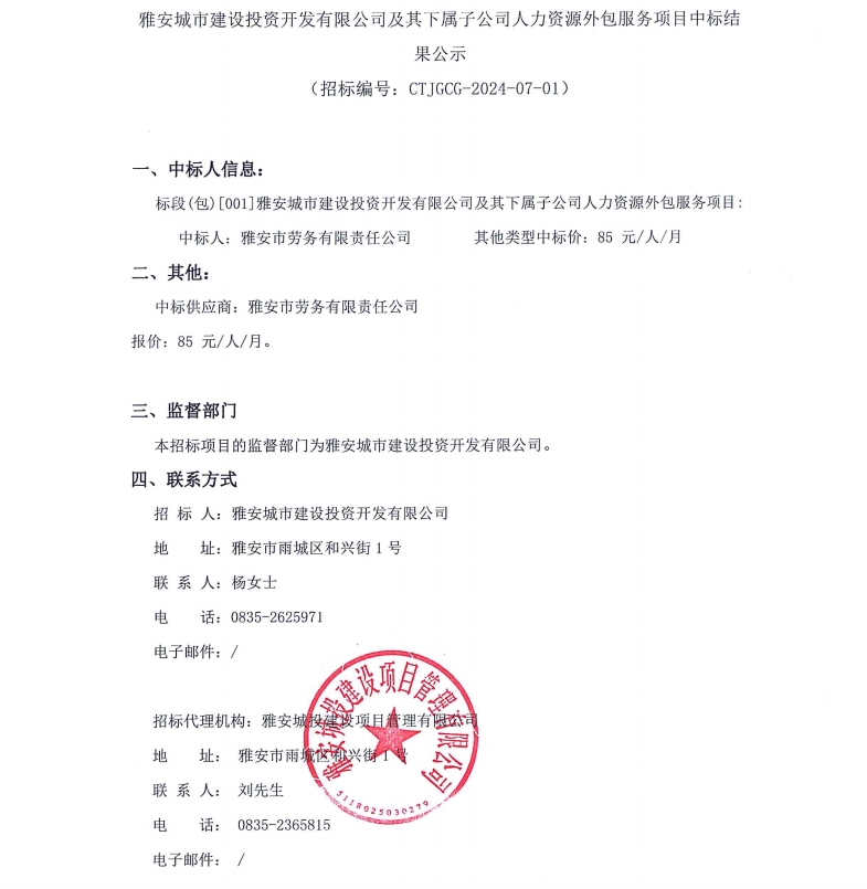 雅安城市建設(shè)投資開發(fā)有限公司及其下屬子公司人力資源外包服務(wù)項(xiàng)目中標(biāo)結(jié)果公示