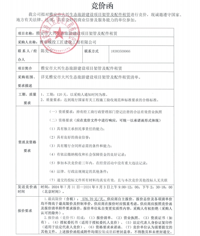 雅安市大興生態(tài)旅游建設(shè)項目架管及配件租賃競價公告