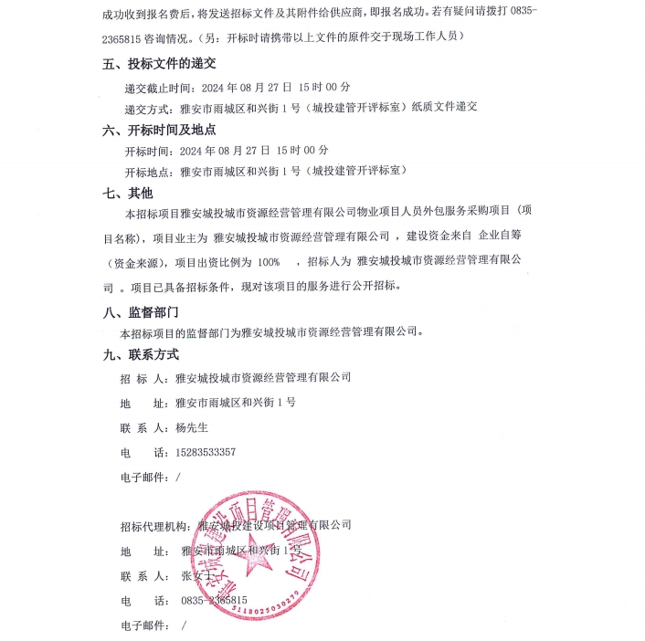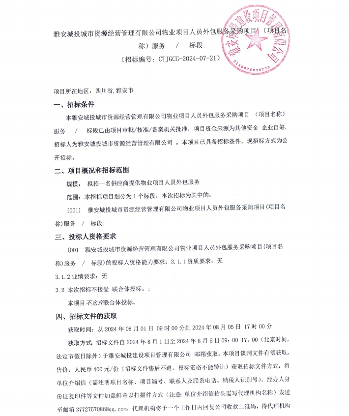 雅安城投城市資源經(jīng)營(yíng)管理有限公司物業(yè)項(xiàng)目人員外包服務(wù)采購(gòu)項(xiàng)目(項(xiàng)目名稱(chēng))服務(wù)/標(biāo)段公告