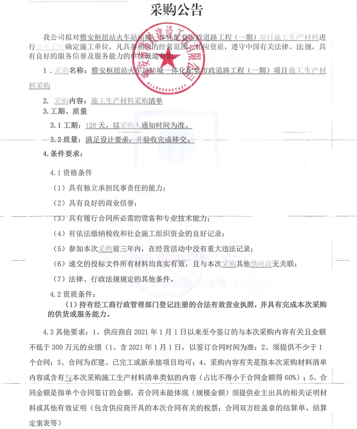 雅安樞紐站火車站站城一體化配套市政道路工程(一期)項(xiàng)目施工生產(chǎn)材料采購公告