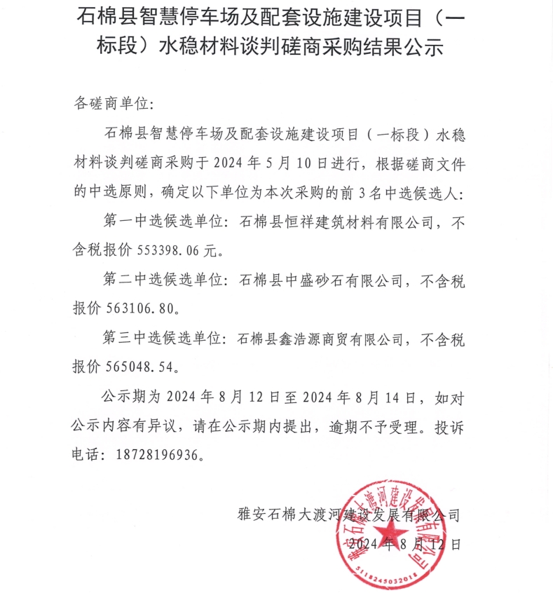 石棉縣智慧停車場及配套設(shè)施建設(shè)項(xiàng)目(一標(biāo)段)水穩(wěn)材料采購談判磋商采購結(jié)果公示