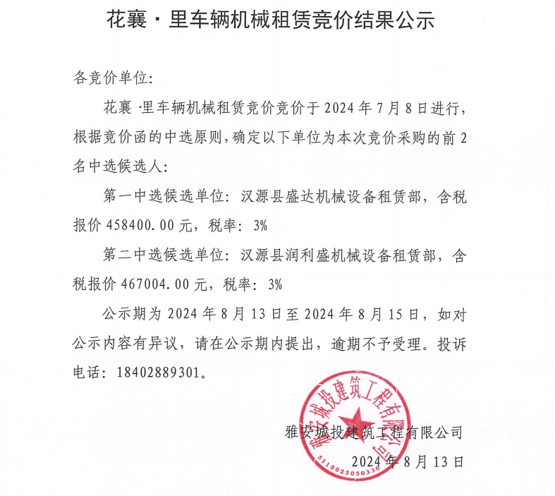 花襄·里項(xiàng)目車輛機(jī)械租賃競價(jià)結(jié)果公示