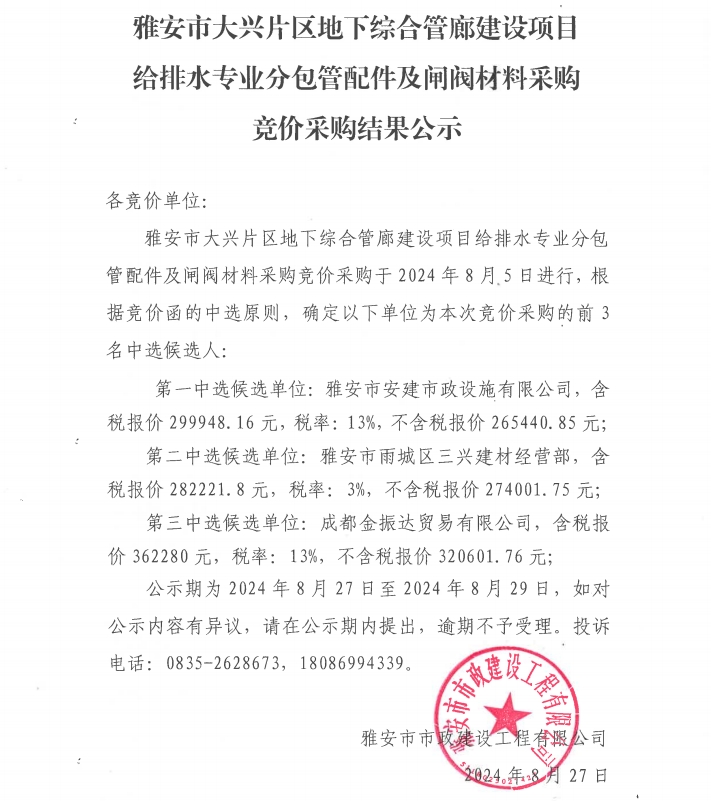 雅安市大興片區(qū)地下綜合管廊建設(shè)項(xiàng)目給排水專業(yè)分包管配件及閘閥材料采購結(jié)果公示