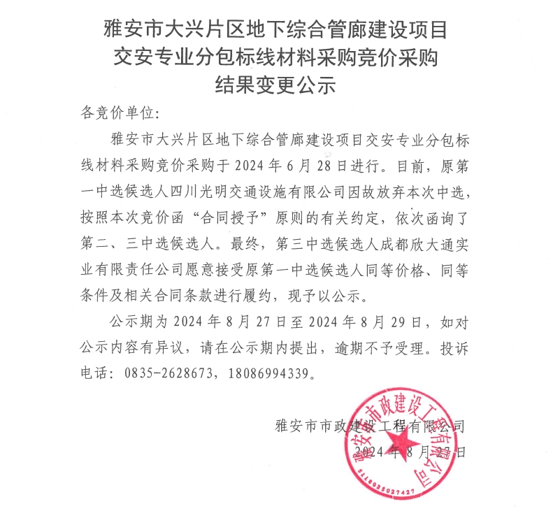 雅安市大興片區(qū)地下綜合管廊建設(shè)項目交安專業(yè)分包標(biāo)線材料采購競價采購結(jié)果變更公示