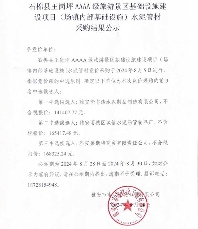 石棉縣王崗坪AAAA級(jí)旅游景區(qū)基礎(chǔ)設(shè)施建設(shè)項(xiàng)目(場(chǎng)鎮(zhèn)內(nèi)部基礎(chǔ)設(shè)施)水泥管材采購(gòu)結(jié)果公示