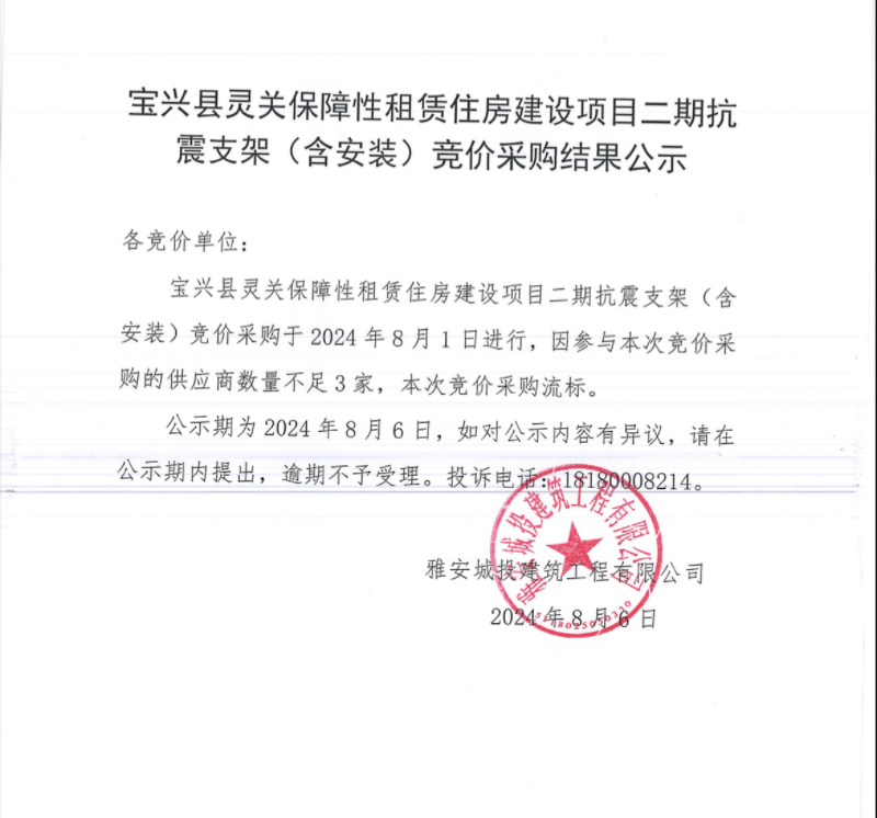 寶興縣靈關(guān)保障性租賃住房建設(shè)項目二期抗震支架(含安裝)競價采購結(jié)果公示