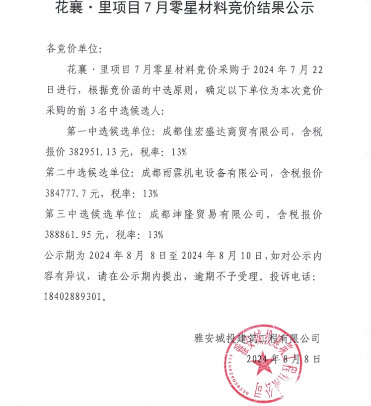 花襄·里項(xiàng)目7月零星材料競價(jià)結(jié)果公示