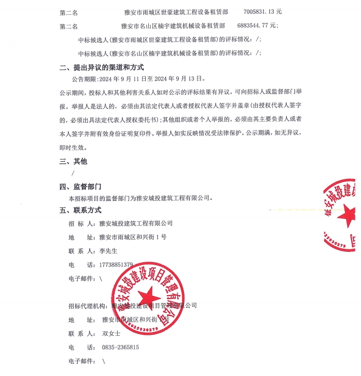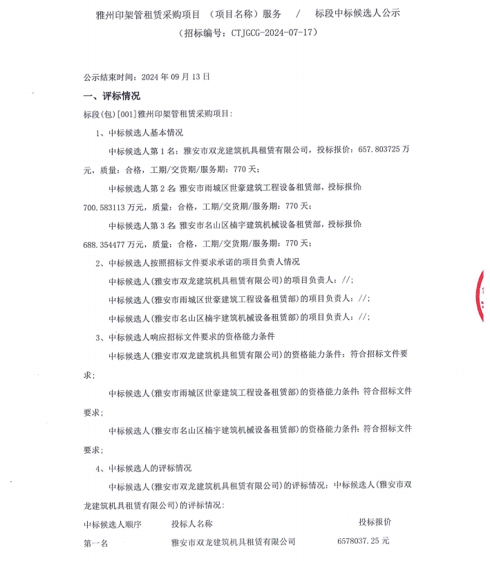 雅州印架管租賃采購項目(項目名稱)服務(wù)/標段中標候選人公示公告