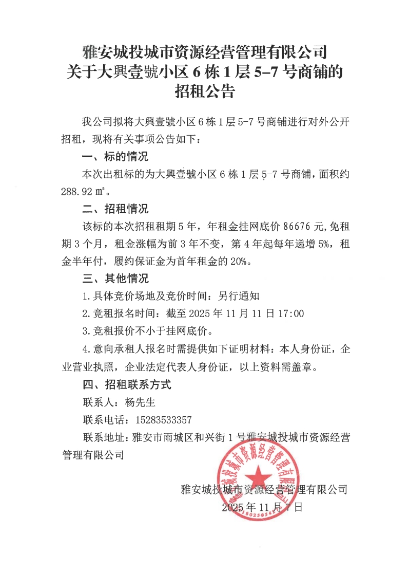 雅安城投城市資源經(jīng)營(yíng)管理有限公司關(guān)于大興壹號(hào)小區(qū)6棟1層5-7號(hào)商鋪的招租公告