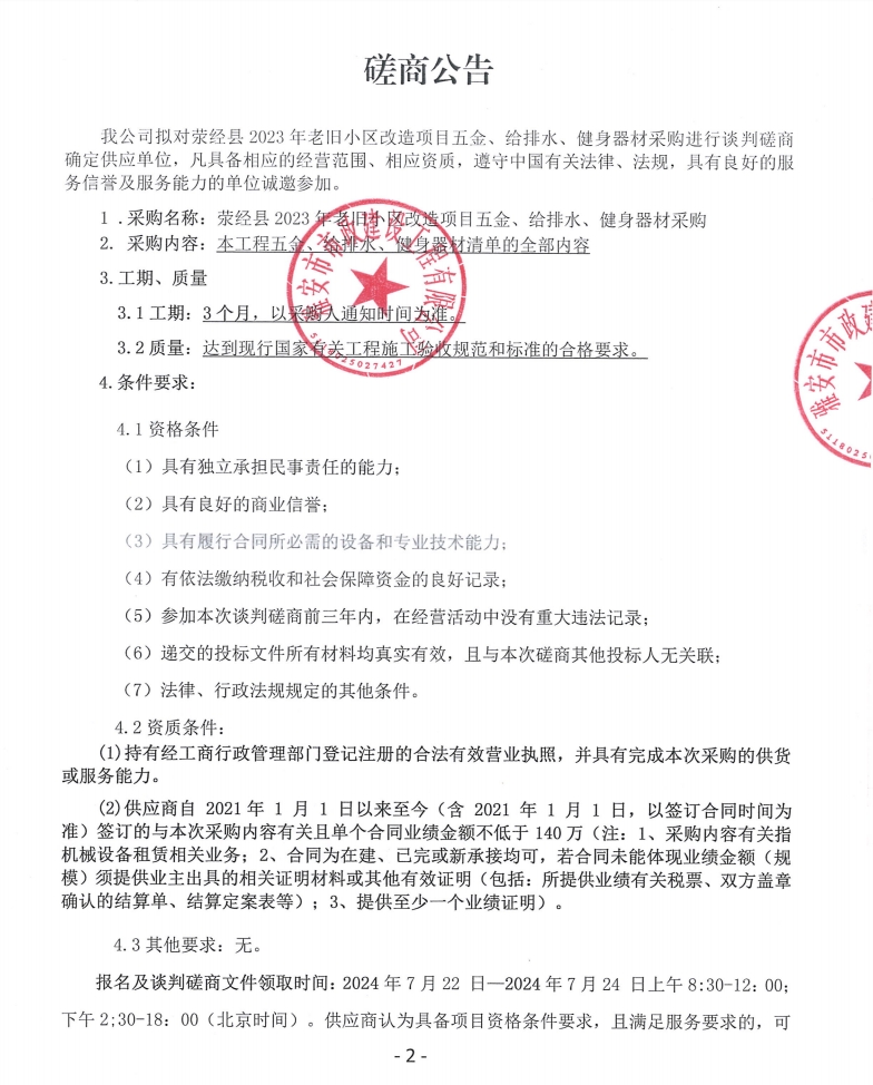 滎經(jīng)縣2023年老舊小區(qū)改造項目五金、給排水、健身器材采購磋商公告