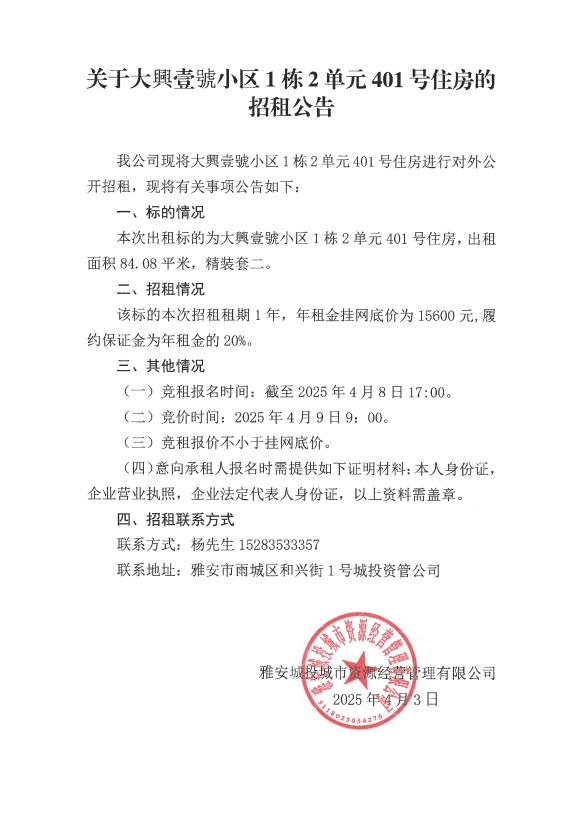 關于大興壹號小區(qū)1棟2單元401號住房的招租公告