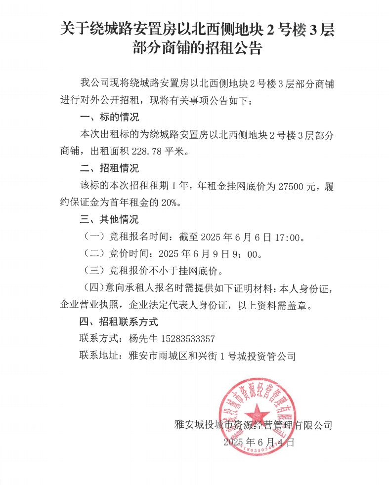 關(guān)于繞城路安置房以北西側(cè)地塊2號樓3層部分商鋪的招租公告