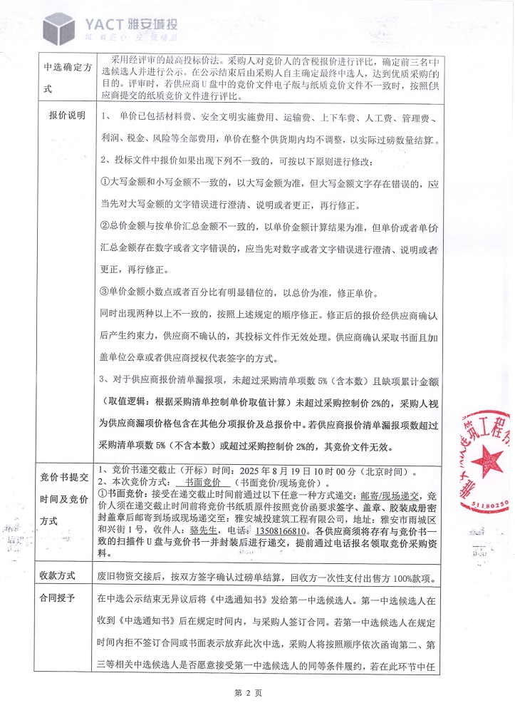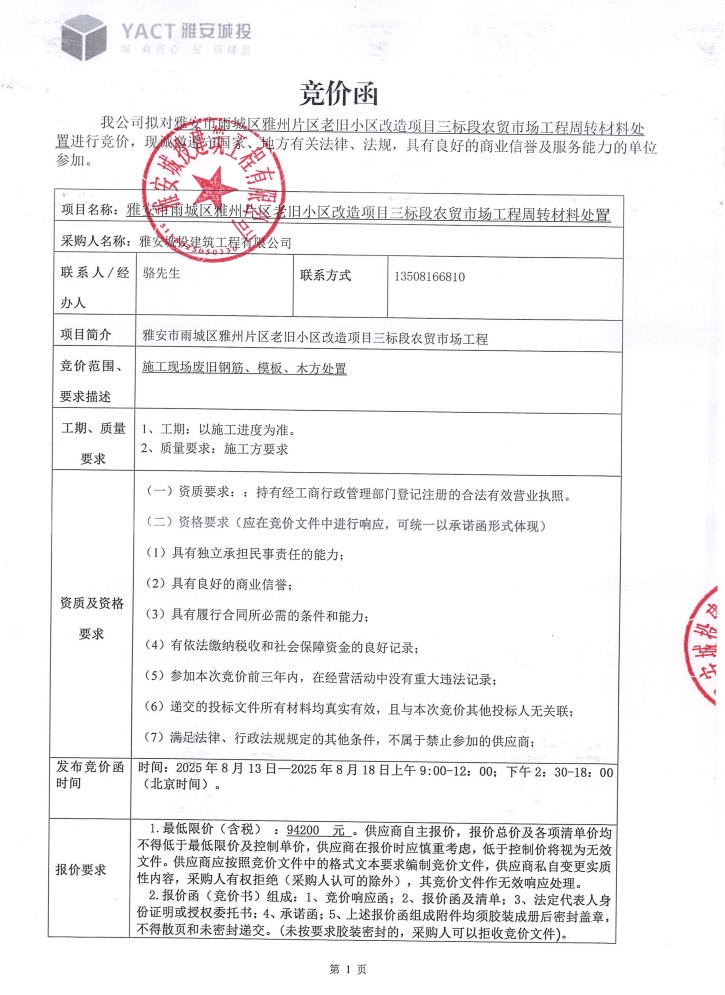 雅安市雨城區(qū)雅州片區(qū)老舊小區(qū)改造項(xiàng)目三標(biāo)段農(nóng)貿(mào)市場(chǎng)工程周轉(zhuǎn)材料處置競(jìng)價(jià)公告