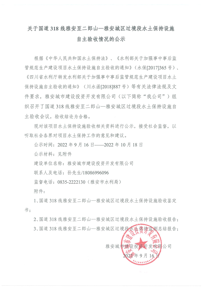 關(guān)于國道318線雅安至二郎山—雅安城區(qū)過境段水土保持設(shè)施自主驗收情況的公示
