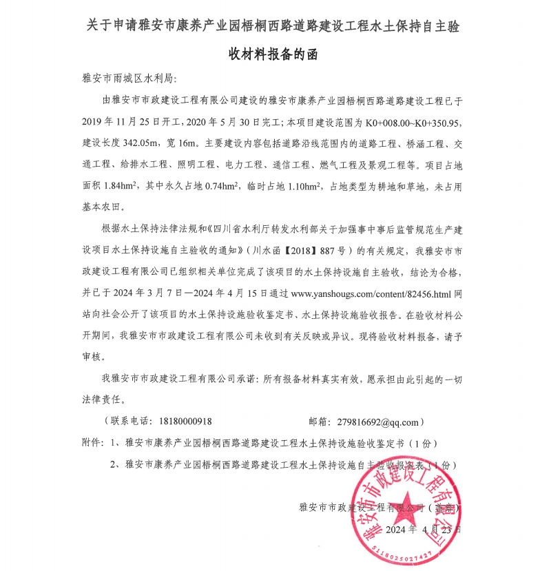 關于申請雅安市康養(yǎng)產(chǎn)業(yè)園梧桐西路道路建設工程水土保持自主驗收材料報備的函